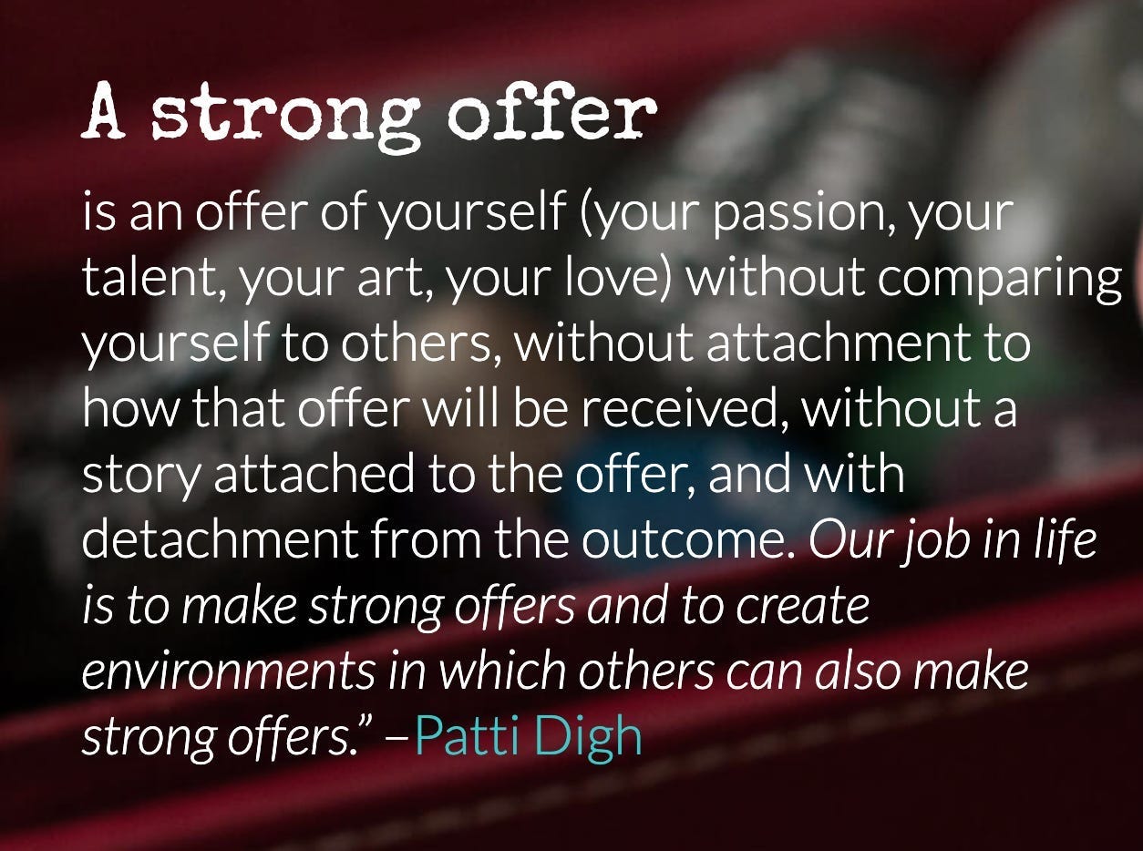 My writerly colleague Patti Digh has a weekly tradition of making Strong Offers: